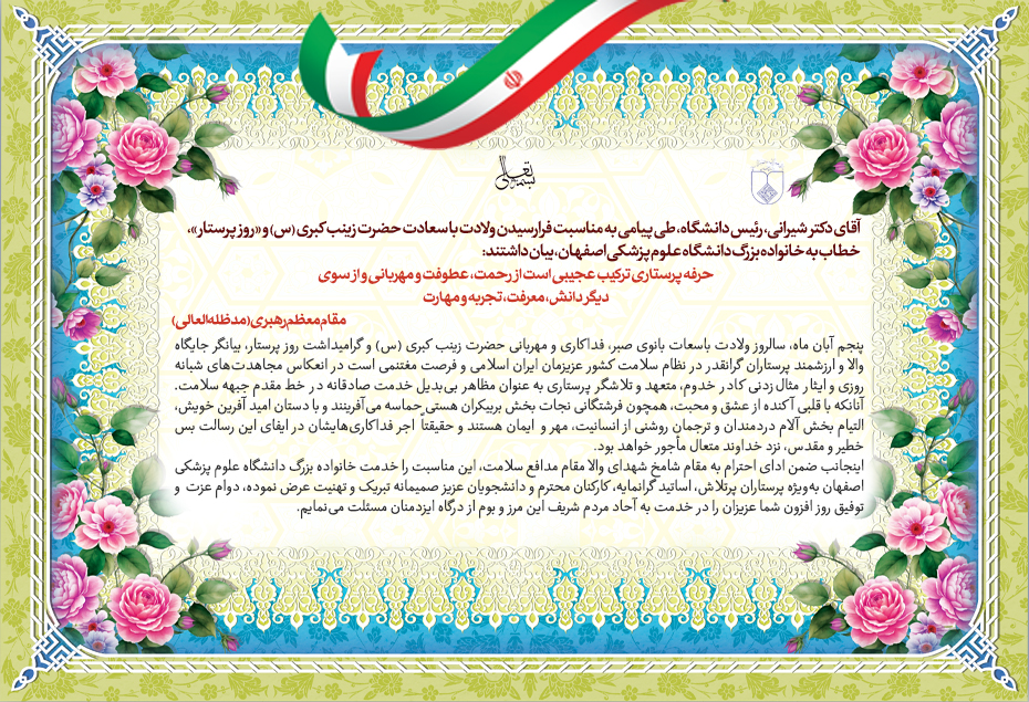 - پیام تبریک رییس دانشگاه به مناسبت میلاد باسعادت حضرت زینب کبری(س) و روز پرستار