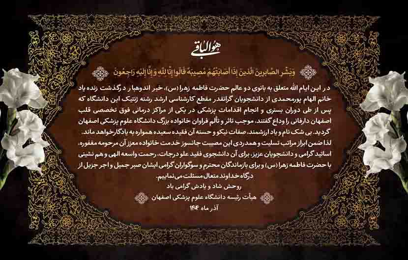 پیام تسلیت هیات رییسه دانشگاه در پی درگذشت دانشجوی گرانقدر رشته ژنتیک (مرحومه الهام پورمحمدی)