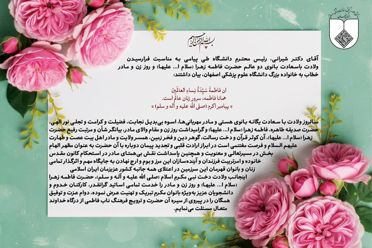 - پیام تبریک رییس دانشگاه بمناسبت خجسته میلاد حضرت فاطمه زهرا (س) و روز مادر