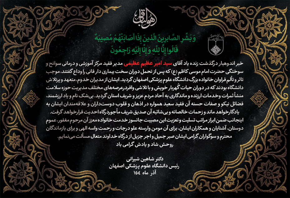 پیام تسلیت رییس دانشگاه در پی درگذشت مدیر فقید مرکز آموزشی درمانی سوانح و سوختگی حضرت امام موسی کاظم (ع) Submitted by ravabet on 14 December 2025 1076 بازدید