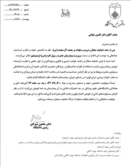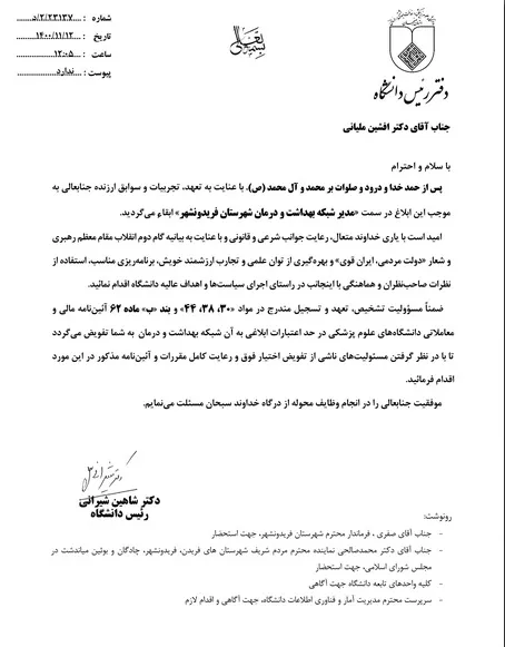 بر اساس حکمی از سوی دکتر شاهین شیرانی رییس دانشگاه، دکتر افشین ملیانی در سمت مدیر شبکه بهداشت و درمان فریدونشهر و سرپرست بیمارستان رسول اکرم (ص) ابقا گردید.