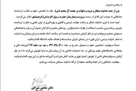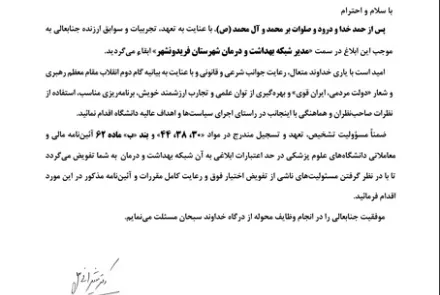 ابقا مدیر شبکه بهداشت و درمان فریدونشهر و سرپرست بیمارستان رسول اکرم (ص)