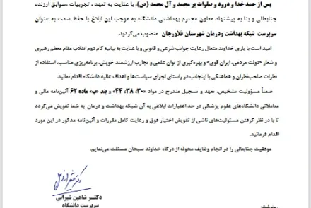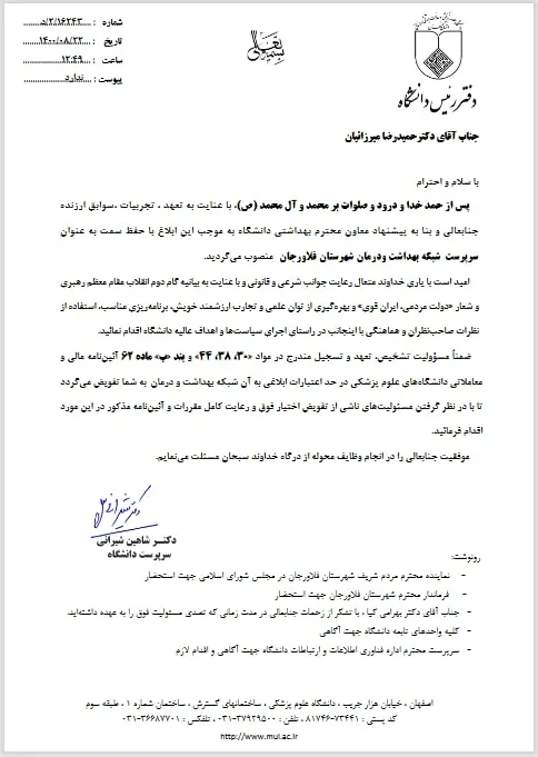 بر اساس ابلاغی از سوی دکتر شاهین شیرانی سرپرست دانشگاه، دکتر حمیدرضا میرزاییان بعنوان سرپرست شبکه بهداشت و درمان شهرستان فلاورجان منصوب گردید.