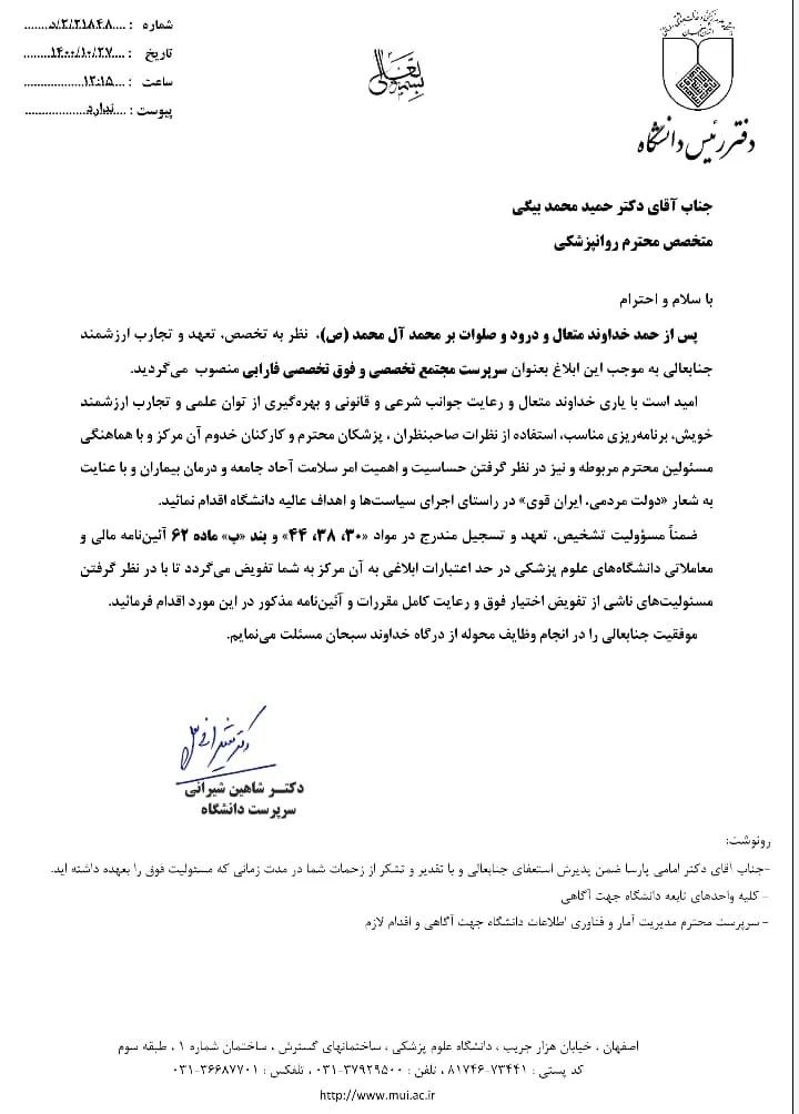 بر اساس حکمی از سوی دکتر شاهین شیرانی رییس دانشگاه، دکتر حمید محمد بیگی متخصص روانپزشکی به عنوان سرپرست مجتمع تخصصی و فوق تخصصی فارابی منصوب شد.