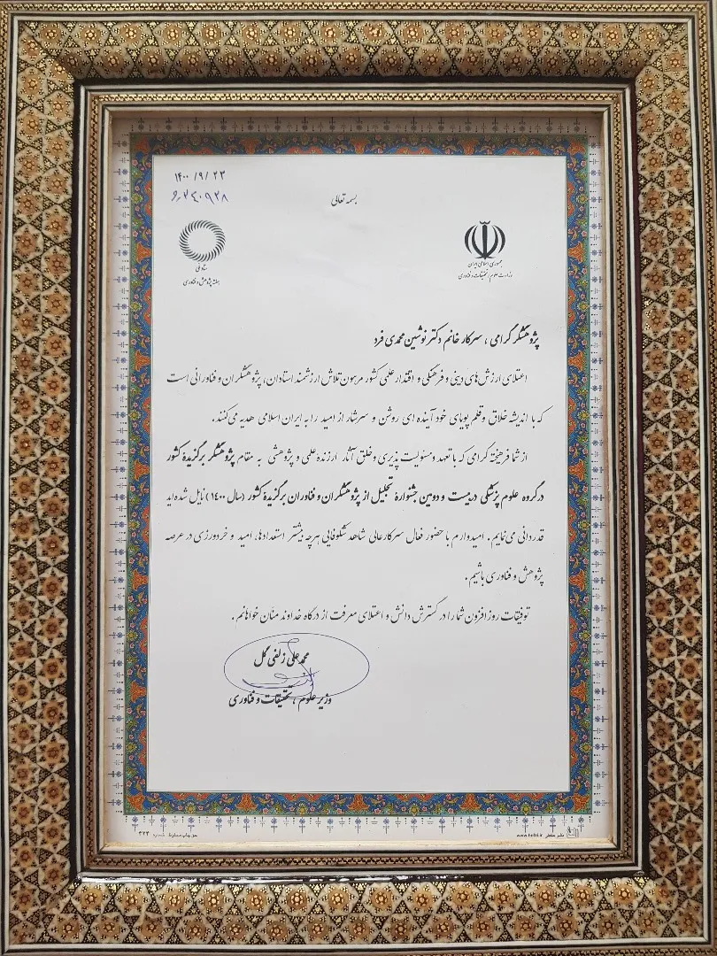 در این مراسم که با حضور دکترمحمدعلی زلفی گل وزیر علوم، تحقیقات و فناوری، دکتر سورنا ستاری معاون علمی و فناوری رییسجمهوری و جمعی از مسئولین کشور برگزار شد، از برترینهای حوزههای پژوهشگران، فناوران، نشریات برتر و انجمنهای برتر و اساتید با بیشترین همکاری با صنعت تقدیر بهعمل آمد، که در میان 23 پژوهشگر برتر در کلیه رشتههای علوم پایه، پزشکی، فنی و مهندسی، دکتر نوشین محمدی فرد عضو هیئت علمی پژوهشکده قلب و عروق دانشگاه علوم پزشکی اصفهان به عنوان یکی از دو نفر پژوهشگر برتر از وزارت بهداشت، درمان و آموزش پزشکی معرفی گردید.
