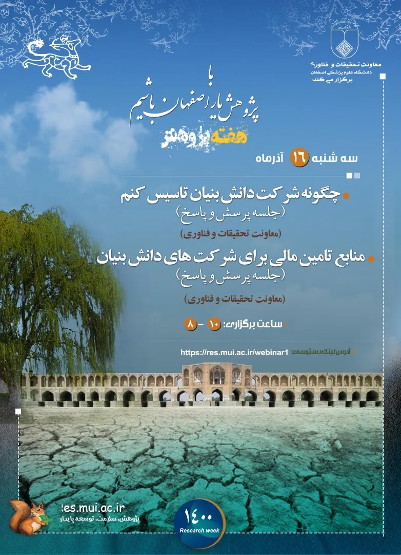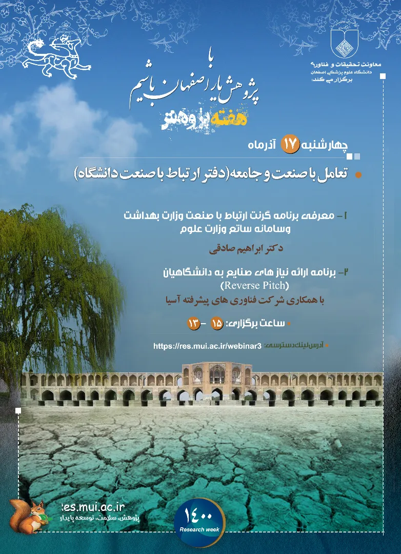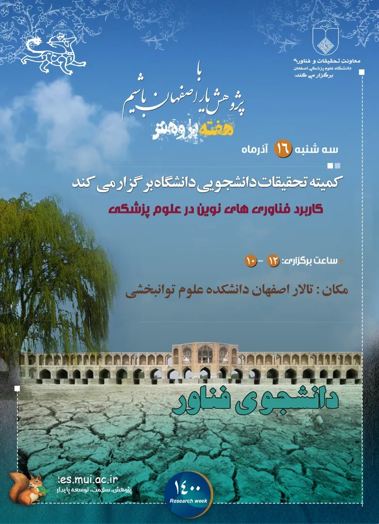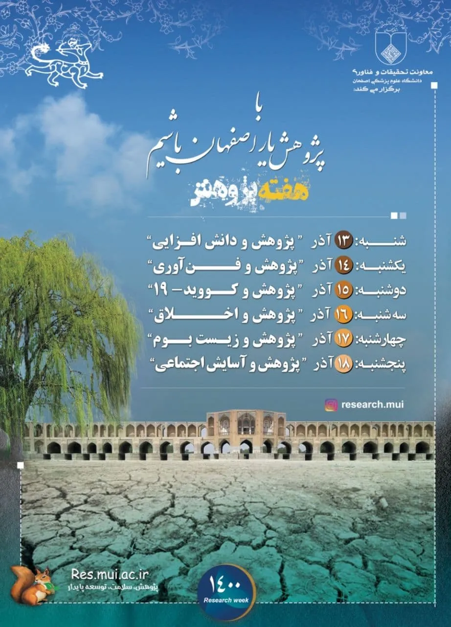 گفتنی است برنامه های هفته پژوهش از 13 تا 19 آذر با شعار با پژوهش یار اصفهان باشیم در دانشگاه علوم پزشکی اصفهان برگزار می شود.