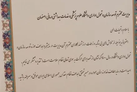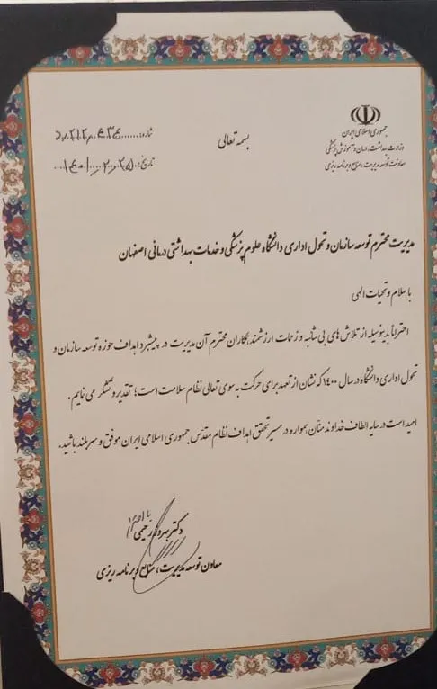 یکشنبه 25 اردیبهشت ماه، در همایش مدیران منابع انسانی و مدیران توسعه سازمان و تحول اداری دانشگاه های علوم پزشکی کشور که توسط وزارت متبوع در محل سالن همایش های هتل قلب شهید رجایی برگزار شد، از مدیریت توسعه سازمان و تحول اداری دانشگاه علوم پزشکی اصفهان به عنوان یکی از ۵ دانشگاه برتر تجلیل بعمل آمد.