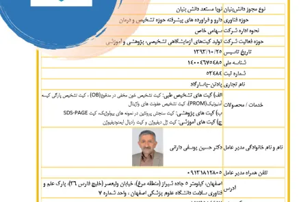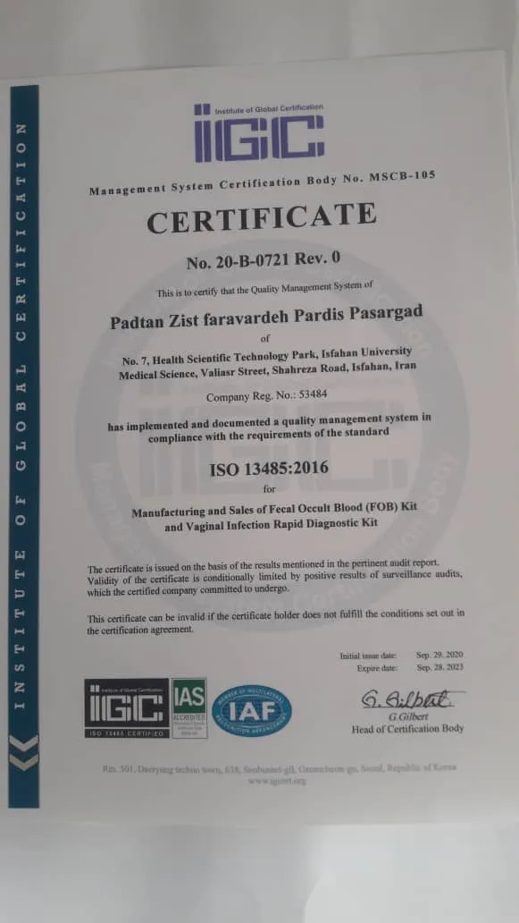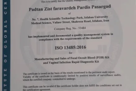 این شرکت ضمن دریافت گواهینامه بین المللی ISO13485:2016 جهت تولید و فروش کیت تشخیص خون مخفی در مدفوع (Fecal Occult Blood)(FOB)Kit  و کیت تشخیص سریع عفونت واژینال Vaginal Infection Rapid Diagnostic Kit، موفق به کسب پروانه ساخت شماره 45681126برای کیت تشخیص سریع خون مخفی در مدفوع Faecal Occult Blood Strips