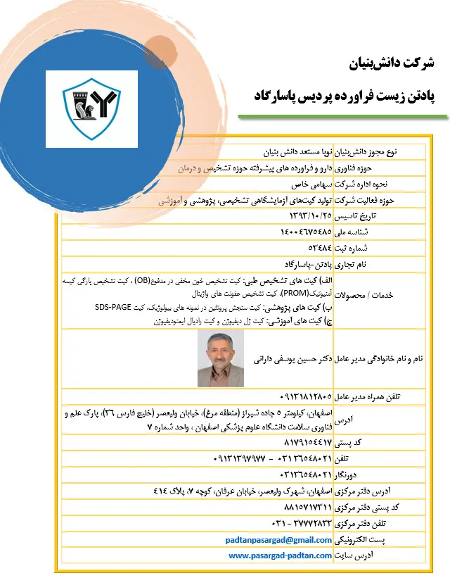 شرکت پادتن زیست فراورده پردیس پاسارگاد از سال ۱۳۹8در پارک علم و فناوری سلامت دانشگاه علوم پزشکی اصفهان مستقر می باشد ودر حوزه تولید انواع کیت های آزمایشگاهی تشخیص طبی شامل کیت تشخیص خون مخفی در مدفوع(FOB)، کیت تشخیص پارگی کیسه آمنیوتیک(PROM) وکیت تشخیص عفونت های واژینال - کیت های پژوهشی سنجش پروتئین در نمونه های بیولوژیک و کیت SDS-PAGE وهمچنین کیت های آموزشی ژل دیفیوژن و کیت رادیال ایمنودیفیوژن فعالیت می نماید.