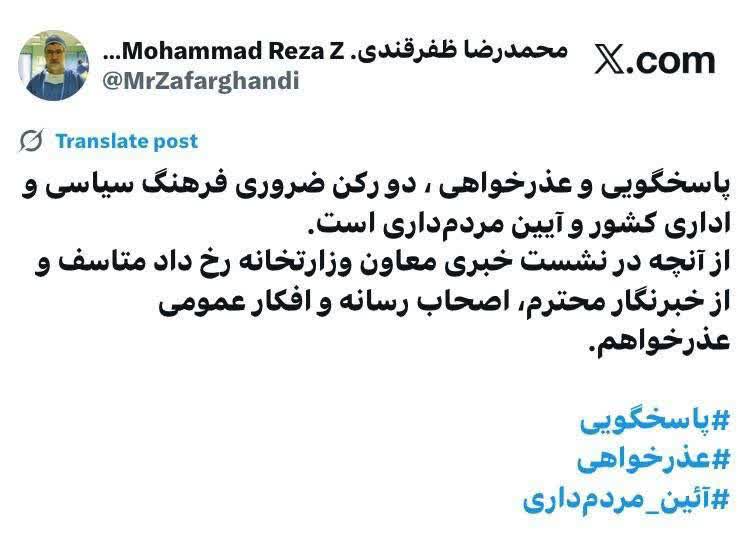 ✅از آنچه در نشست خبری معاون وزارتخانه رخ داد متاسف و از خبرنگار محترم، اصحاب رسانه و افکار عمومی عذرخواهم.