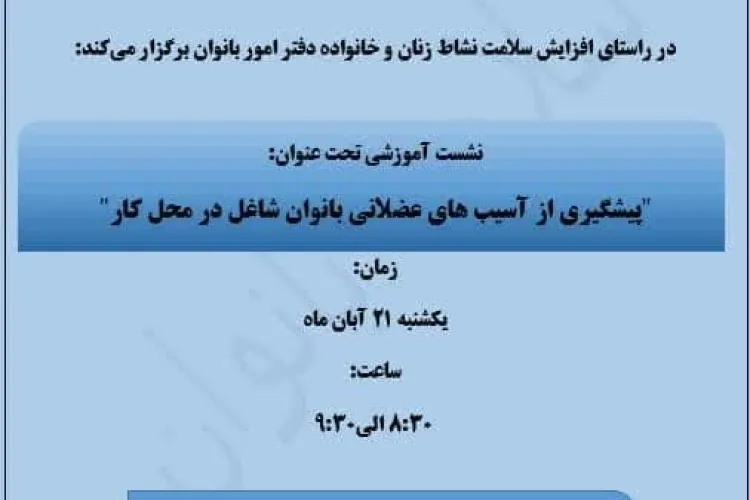 در راستای افزایش سلامت نشاط زنان و خانواده دفتر امور بانوان برگزار میکند: نشست آموزشی تحت عنوان: "پیشگیری از آسیب های عضلانی بانوان شاغل در محل کار"