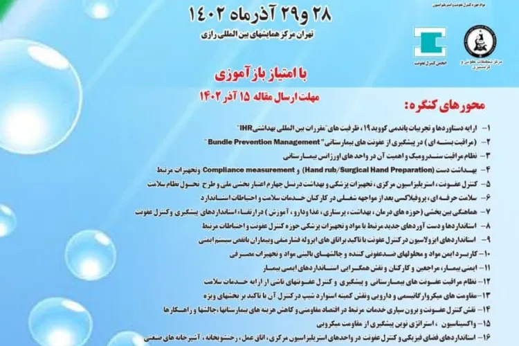 کفایت کوریکولوم آموزشی جدید اقتصاد سلامت در توانمندسازی فارغالتحصیلان رشتهیازدهمین کنگره تخصصی و پنجمین کنگره بین المللی کنترل عفونت و استریلیزاسیون، مواد و تجهیزات، 29-28 آذرماه، در مرکز همایش های بین المللی رازی تهران برگزار خواهد شد.