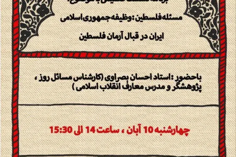 بسیج دانشجویی دانشگاه علوم پزشکی اصفهان نشست صمیمی را تحت عنوان "مسئله فلسطین: وظیفه جمهوری اسلامی در قبال آرمان فلسطین" برگزار می کند.