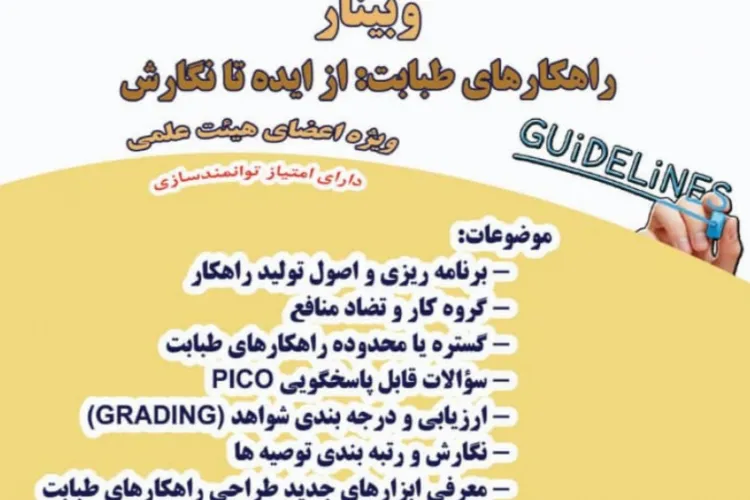 گفتنی است محتوای این وبینار شامل مباحث مورد نیاز برای طراحی گایدلاین می باشد و ایزارهای تهیه شده برای فرایند تهیه بومی سازی و به روز رسانی گایدلاین معرفی خواهند شد.