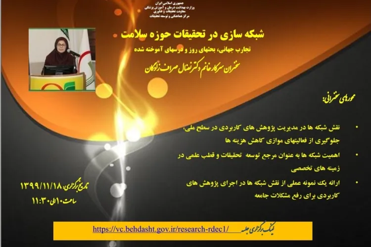 در همین راستا اولین وبینار علمی کشوری با عنوان شبکه سازی در تحقیقات حوزه سلامت: تجارب جهانی، بحثهای روز و درسهای آموخته شده، با سخنرانی دکتر نضال صراف زادگان، را از ساعت 10 تا 11:30 صبح روز شنبه 18 بهمن ماه ارائه نماید.