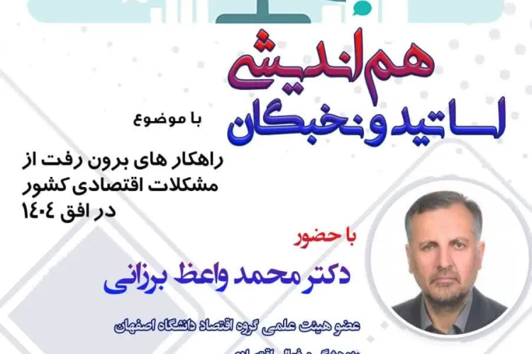 نشست هم اندیشی اساتید و نخبگان با موضوع: «راهکارهای برون رفت از مشکلات اقتصادی کشور در افق 1404 » 🎙با حضور : دکتر محمد واعظ برزانی (عضو هیئت علمی گروه اقتصاد دانشگاه اصفهان، پژوهشگر و فعال اقتصادی)