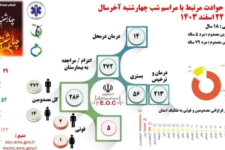 آخرین وضعیت مصدومیت ها و فوتی های ناشی از حوادث چهارشنبه آخرسال از ابتدای اسفند تا 22 اسفندماه