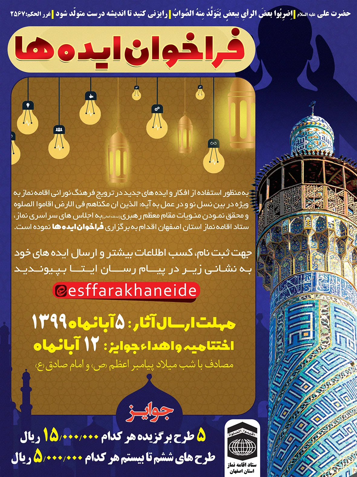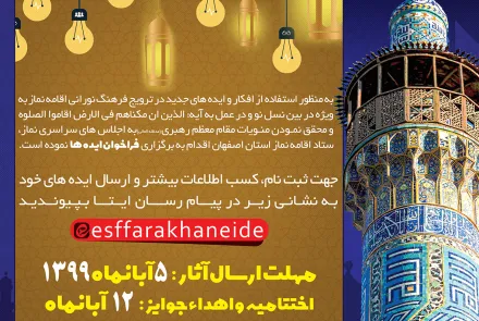ستاد اقامه نماز استان اصفهان با هدف بهره مندی از ظرفیت جامعه نخبگانی و دسترسی به ایده ها و طرح های نو و خلاقانه در امر اقامه نماز، اقام به فراخوان ایده ها در این زمینه نموده است.