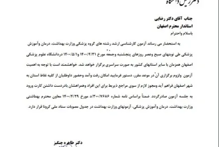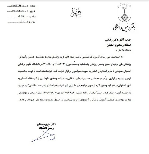لازم به ذکر است با توجه به اهمیت آزمون و لزوم برگزاری آن در موعد مقرر و طبق مکاتبه انجام شده با استانداراصفهان امکان رفت وآمد وحضور داوطلبان از کلیه نقاط استان به شهر اصفهان فراهم و مجوز لازم از سوی مراجع ذیربط برای این افراد وهمراهشان با دردست داشتن کارت ورود به جلسه آزمون صادرگردد.