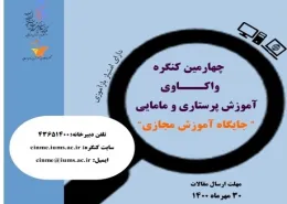دانشکده پرستاری و مامایی دانشگاه علوم پزشکی ایران(واقع در شهر تهران)، با همکاری مرکز مطالعات و توسعه آموزش پزشکی و مرکز تحقیقات مراقبت های پرستاری "چهارمین کنگره واکاوی آموزش پرستاری و مامایی: جایگاه آموزش مجازی" را 23 لغایت 24 آذرماه سال جاری برگزار خواهد نمود.