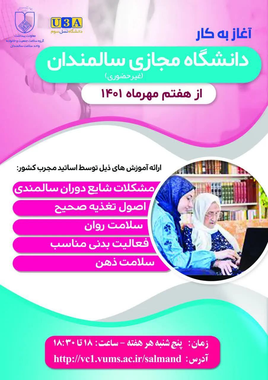 اداره سلامت سالمندان وزارت بهداشت، درمان و آموزش پزشکی در راستای مسئولیت خود در آموزش و توانمند سازی سالمندان، خانواده آنان و عموم جامعه در خصوص مباحث سالمندی اقدام به راه اندازی دانشگاه مجازی سالمندان از 7 مهر ماه 1401 نموده است.