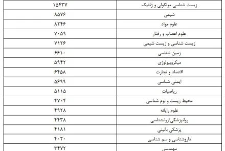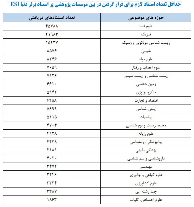 مؤسسه کلاریویت آنالیتیکس حداقل تعداد مستندات لازم برای قرار گرفتن در بین مؤسسات پژوهشی پراستناد برتر دنیا در حوزههای موضوعی مختلف را اعلام کرده که در جدول زیر قابل مشاهده است: