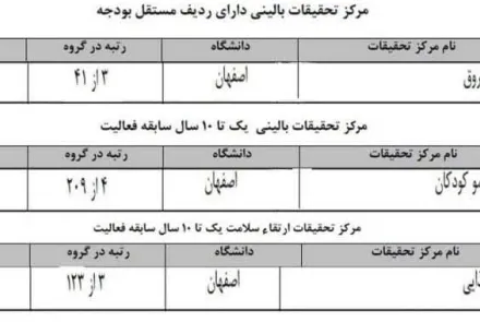 کسب رتبه کشوری سه مرکز از مراکز تحقیقاتی دانشگاه علوم پزشکی اصفهان در بین مراکز تحقیقاتی کل کشور