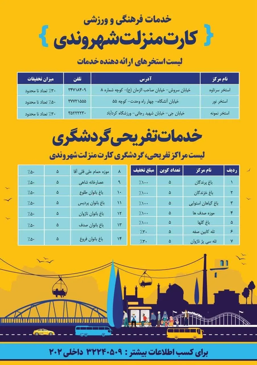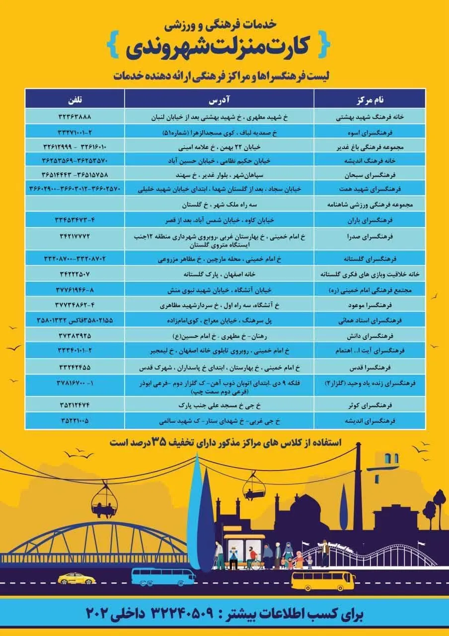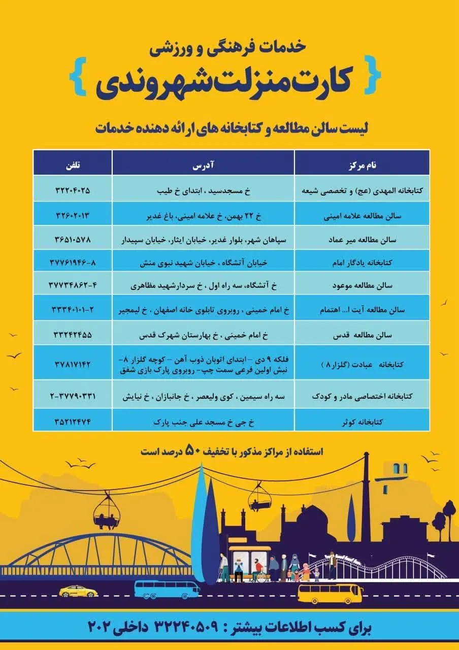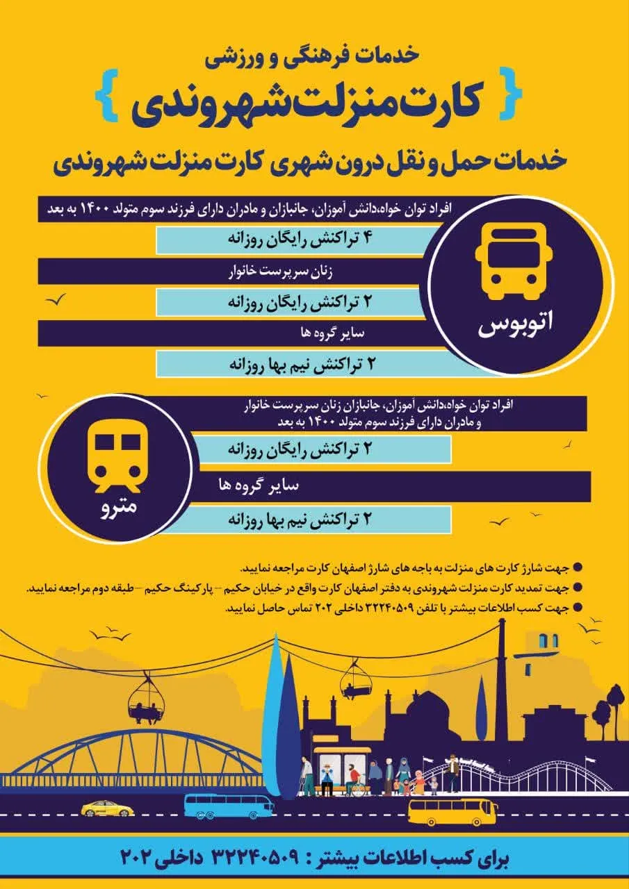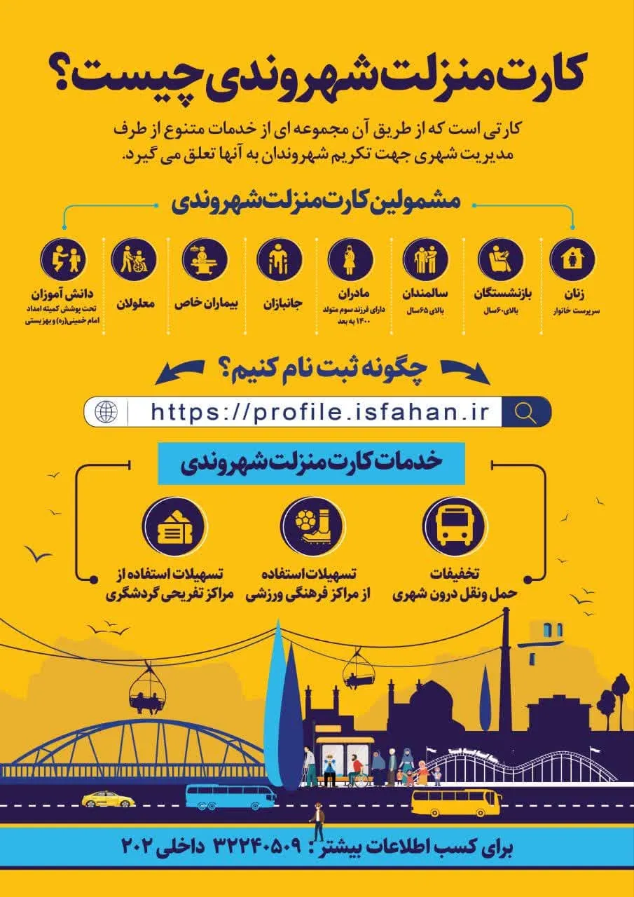 معاونت بهداشتی دانشگاه اعلام نمود: به منظور بهره مندی از خدمات شهرداری اصفهان در راستای قانون حمایت از خانواده و جوانی جمعیت و همچنین اطلاع رسانی طرح تکریم شهروندان در قالب "کارت منزلت شهروندی" فهرست مشمولین و تسهیلات، لینک های ثبت نام و دسترسی به سامانه و تراکت های راهنما به شرح زیر می باشد: