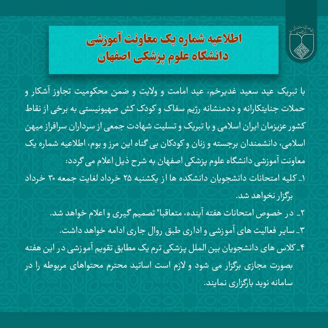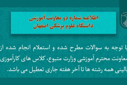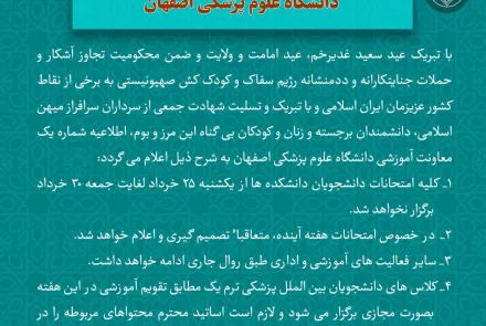 اطلاعیه معاونت آموزشی دانشگاه در خصوص برگزاری امتحانات دانشجویان و کلاس های کارآموزی بالینی Submitted by ravabet on 14 June 2025 Log in to post comments1104 بازدید
