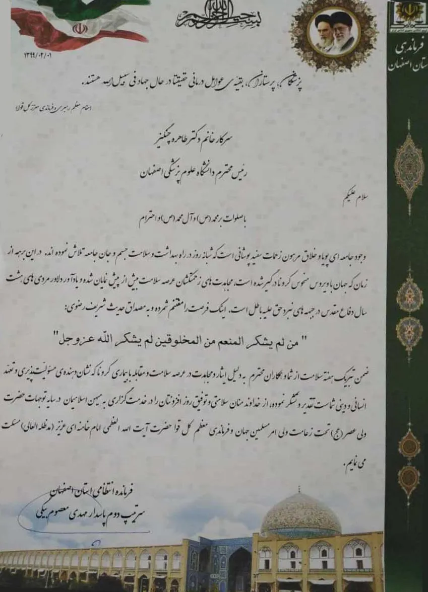 سرتیپ دوم پاسدار مهدی معصوم بیگی فرمانده انتظامی استان اصفهان طی پیامی، از زحمات و مجاهدت های رییس دانشگاه، کادر درمان و تمامی زحمتکشان عرصه سلامت استان در مقابله با بیماری کرونا تشکر و قدردانی نمود.