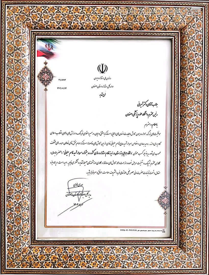 در این آیین، دکتر زهرا اسفندیاری، عضو هیئت علمی مرکز تحقیقات تغذیه و امنیت غذایی دانشگاه، به نمایندگی از دانشگاه لوح تقدیر را از استاندار اصفهان دریافت کرد. این افتخار بهپاس مشارکت مؤثر در تدوین سه استاندارد ملی بر پایه طرحهای تحقیقاتی مصوب در معاونت تحقیقات و فناوری و نیز نقش فعال در کمیسیونها و کمیتههای تخصصی استانداردسازی به دانشگاه تعلق گرفت.