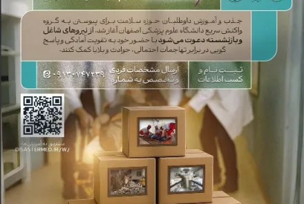 فراخوان جذب عضو گروه واکنش سریع دانشگاه علوم پزشکی اصفهان فراخوان جذب عضو گروه واکنش سریع دانشگاه علوم پزشکی اصفهان بمنظور جذب و آموزش داوطلبان حوزه سلامت برای پیوستن به گروه های واکنش سریع دانشگاه آغاز شد. جهت ارسال مشخصات فردی و تخصص به شماره : 09130747239 پیامک نمایید. 4 بازدید