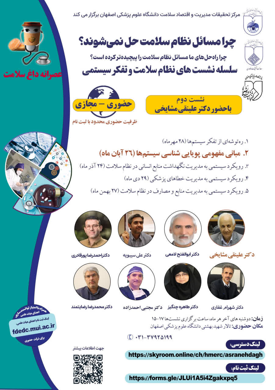 عصرانه داغ سلامت/ سلسله نشست های نظام سلامت و تفکر سیستمی Submitted by ravabet on 9 November 2025 عصرانه داغ سلامت 🔹سلسله نشست های نظام سلامت و تفکر سیستمی -زمان: دوشنبه های آخر هر ماه، ساعت: 17-15 مکان حضوری: تالار شهید بهشتی دانشگاه علوم پزشکی اصفهان 14 بازدید