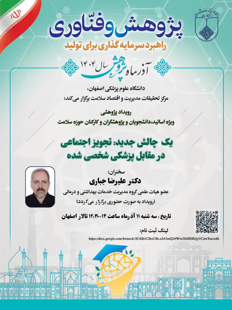 مرکز تحقیقات مدیریت و اقتصاد سلامت دانشگاه علوم پزشکی اصفهان *اولین جلسه؛ آذرماه پژوهش* را با عنوان یک چالش جدید: تجویز اجتماعی پزشکی شخصیسازی شده برگزار میکند