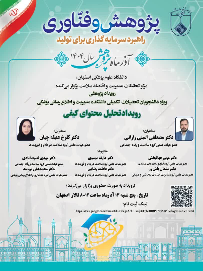 مرکز تحقیقات مدیریت و اقتصاد سلامت دانشگاه علوم پزشکی اصفهان *دومین جلسه؛ آذرماه پژوهش* با عنوان ترویداد تحلیل محتوای کیفی (Qualitative Content Analysis) برگزار میکند